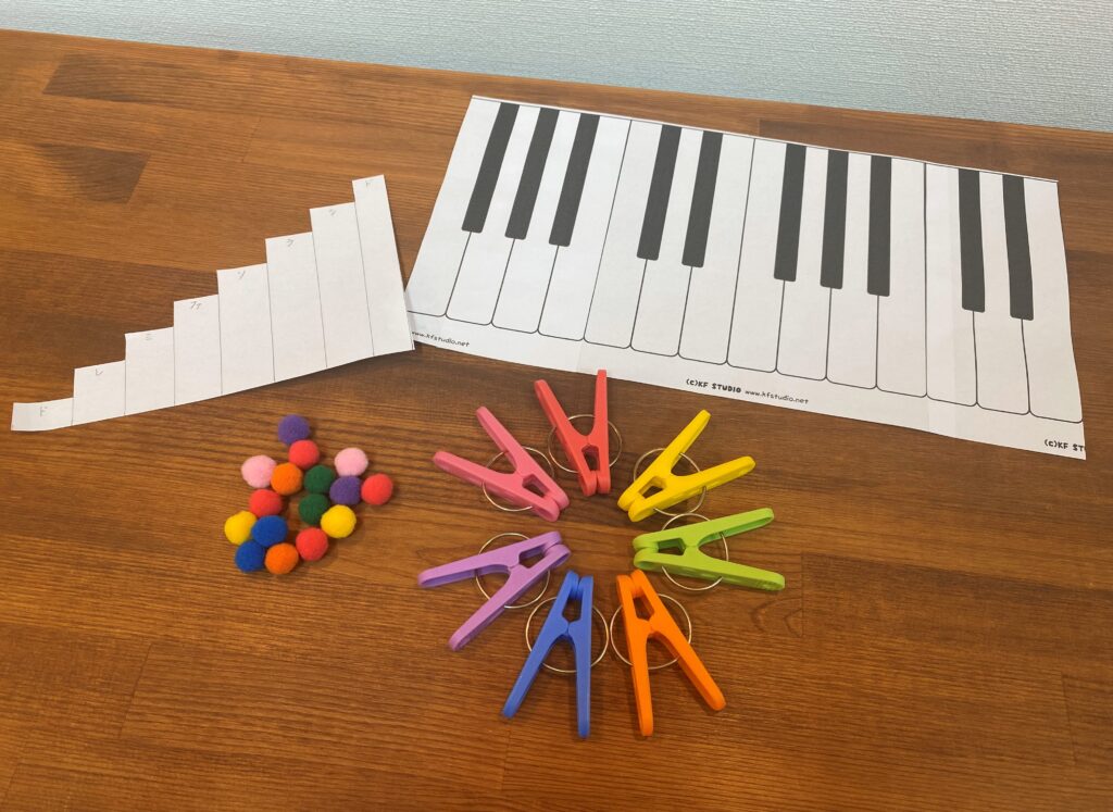 レッスンの様子です♪洗濯バサミを使って指のトレーニングを行いました! ポンポンボールを洗濯バサミで挟んで、紙鍵盤の上に運びます。 子どもたちはしっかり... -