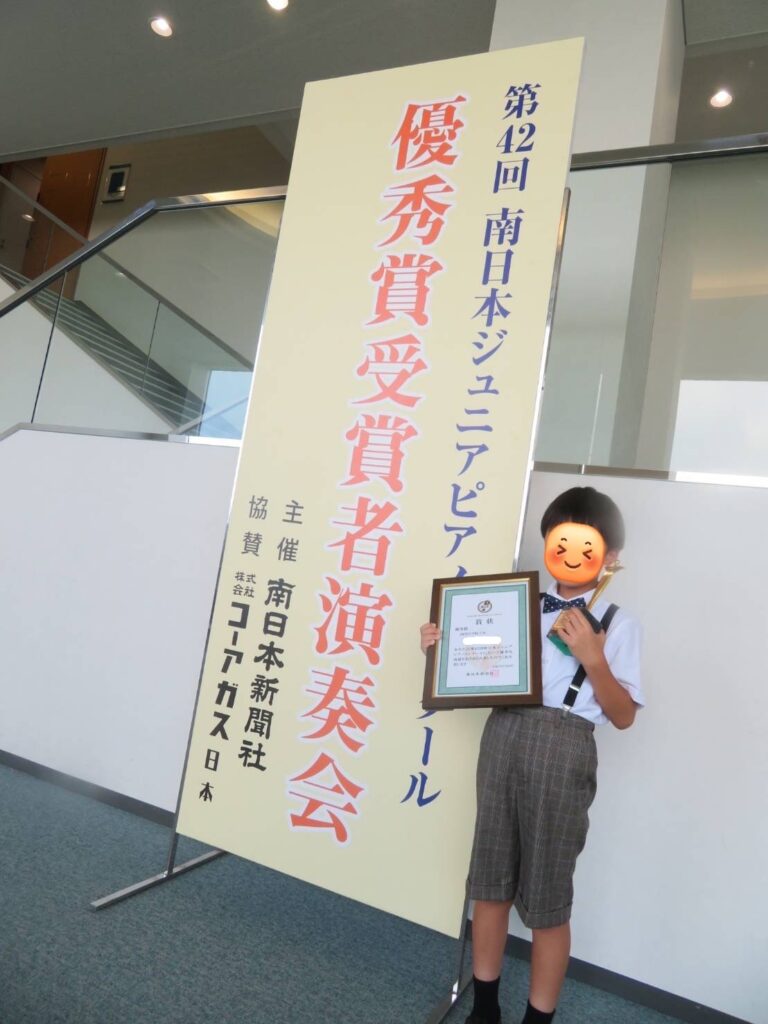 8月に行われた第42回南日本ジュニアピアノコンクールにて、生徒さん(Yくん)が見事、優秀賞を受賞しました!初出場で初入賞。おめでとうございます♬✨20日には、優秀賞受... -